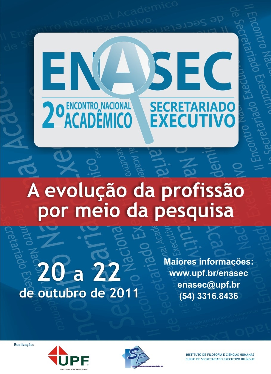 O 2º Encontro Nacional Acadêmico de Secretariado Executivo-ENASEC acontecerá de 20 a 22 de outubro de 2011 e tem como tema “A evolução da profissão por meio da pesquisa”. Trata-se de um evento de cunho científico, promovido pelo curso de Secretariado Executivo Bilíngue da UPF, cujo objetivo central é reunir docentes, acadêmicos e profissionais da área secretarial para debater a investigação científica no processo evolutivo da profissão bem como promover a própria pesquisa no meio. Maiores informações: https://www.upf.br/enasec/